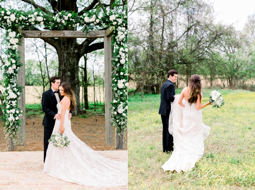 Mallory & Raymond held their reception at Bridlewood of Madison as well, at their indoor barn. They danced their first dance to Born to Love you by Lanco. They had Al Paris and the Heartbreakers to entertain them and their guests for the duration of the night. Wendy Putt with Fresh Cut Catering & Floral as always did an amazing job with all of the floral arrangements and greenery! It was beyond enchanting. They chose Cakes by Iris for their wedding cakes and man, weren’t they gorgeous?! Raymond’s was a golf themed grooms cake and Mallory’s an exquisite, three tier, white cake with satin ribbon on each layer and adorning flowers! And lets not skip over that AHH-MAZING backdrop below the cake!! -see below and more if you keep scrolling 🙂